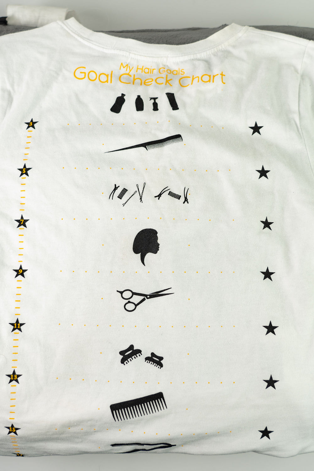 Keep track of your goals in a My Hair Goals length check T! Each Item on the back is placed 2 inches apart from the next! Hair growth can seem like a lengthy process when you're doing it on your own, so be sure to take pictures and tag #myhairgoals for some love and support along your journey!